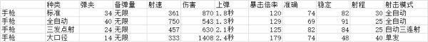 标准手枪,自动霰弹枪狭窄,冲锋枪标准、战术,轻机枪稳定,突击步枪战术,双管猎枪标准、粉碎者,自动狙击步枪标准